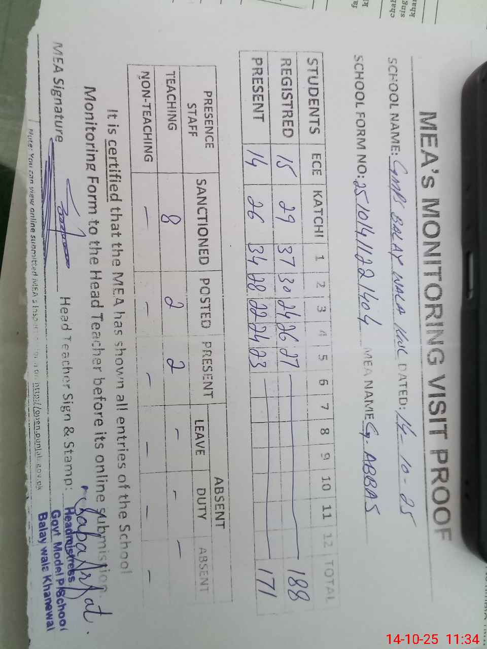 | EMIS Code: 36420422 | Name of School: GMPS BALAY WALA, KHANEWAL | |||