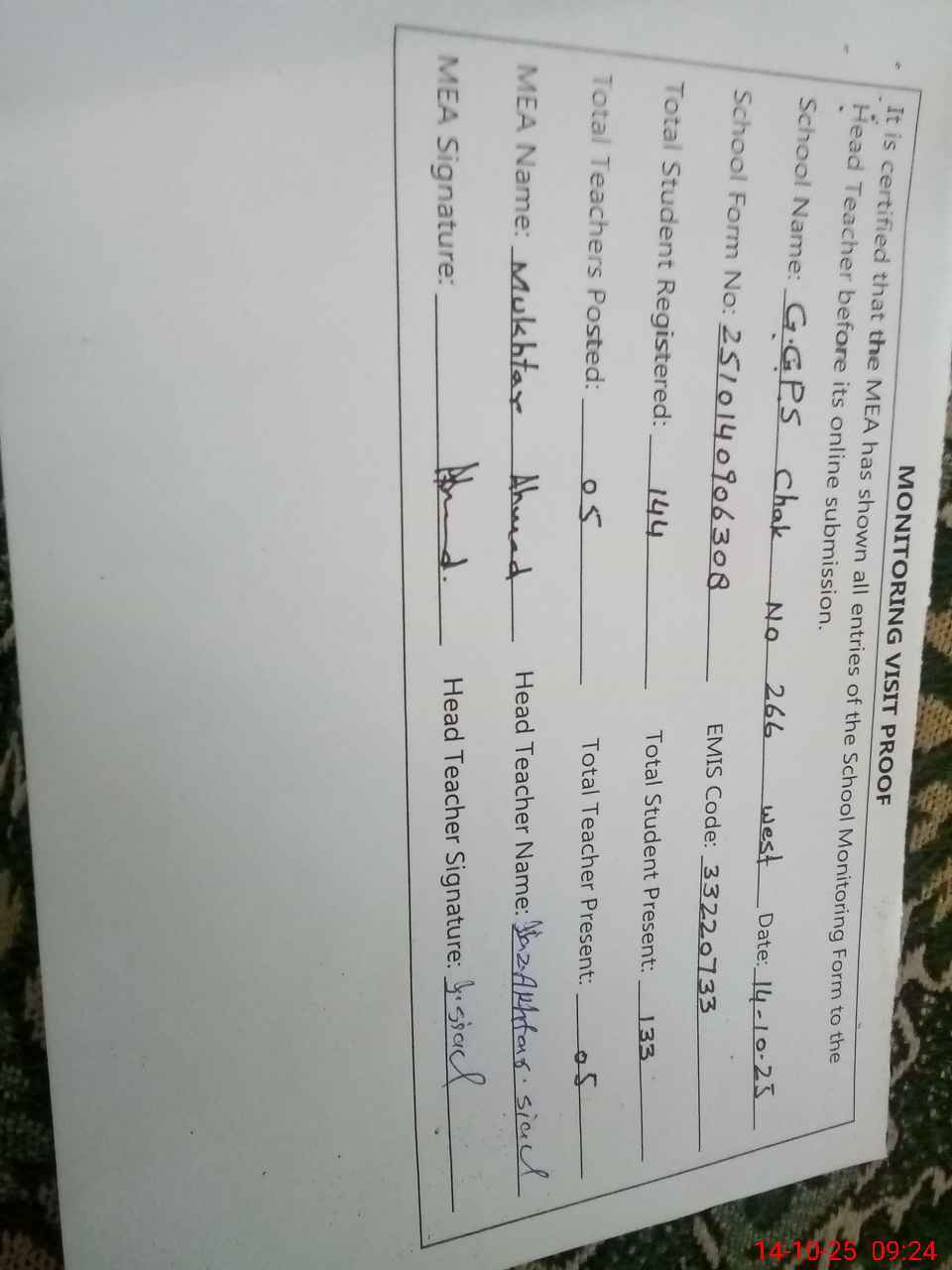 | EMIS Code: 33220733 | Name of School: GGPS CHAK NO 266 WEST | |||