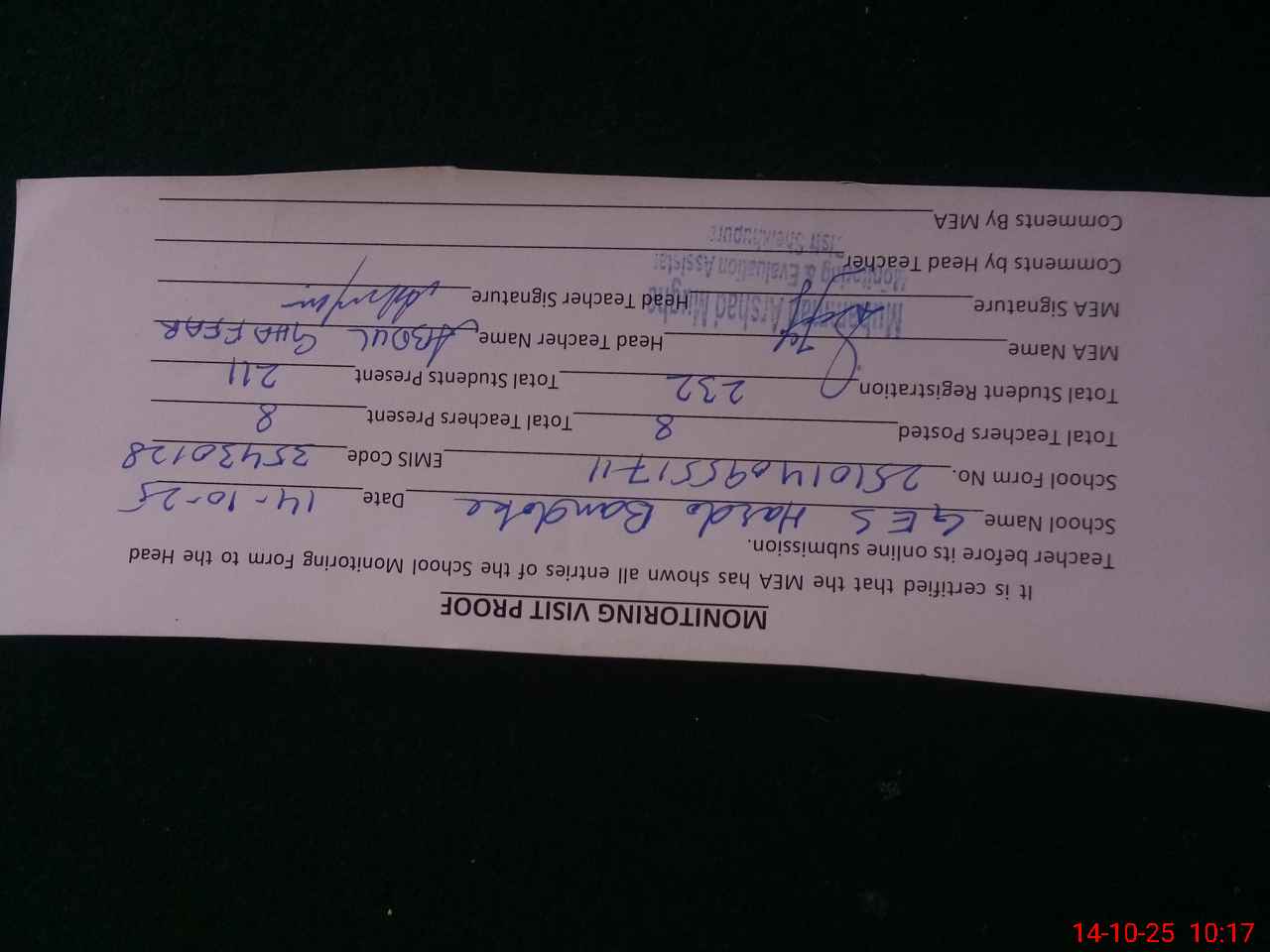 | Attendance Register | Head Teacher | MEA with School | Visit Proof |