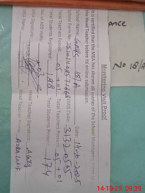 | Certified that this School was Inspected by the Undersigned MEA/DMO Today and the Information Stated Above is as Per Record. | |||||