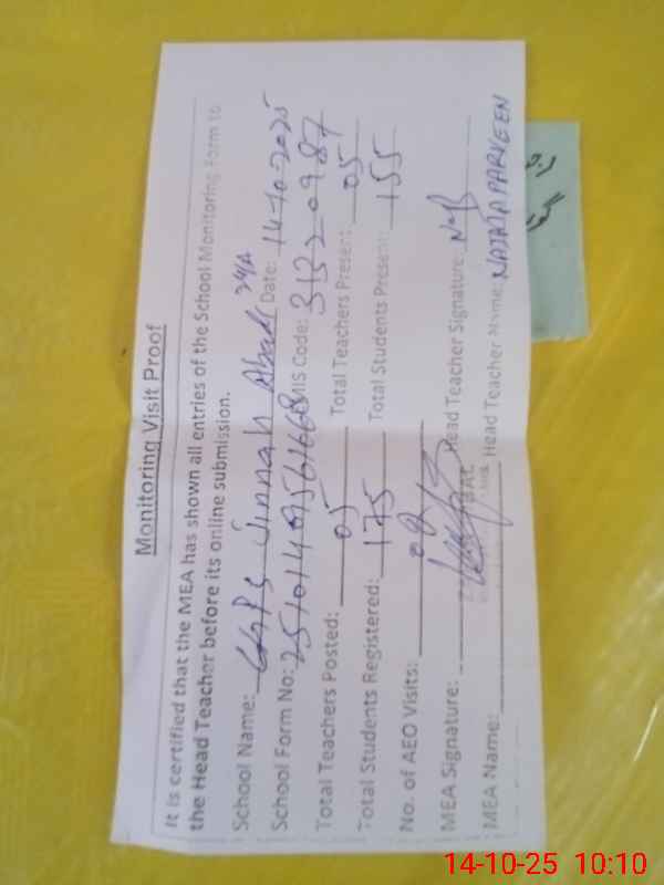 | Certified that this School was Inspected by the Undersigned MEA/DMO Today and the Information Stated Above is as Per Record. | |||||