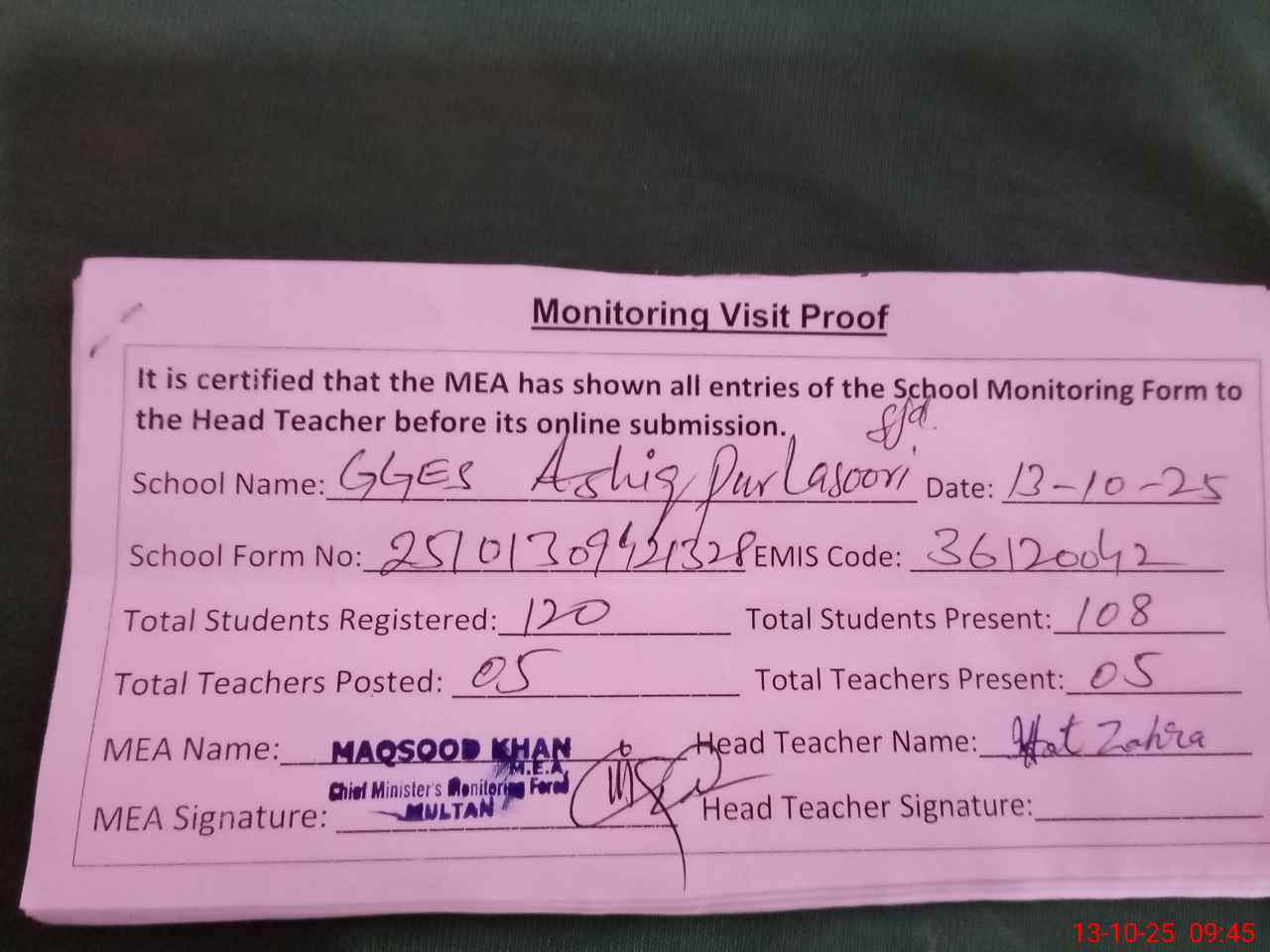 | Attendance Register | Head Teacher | MEA with School | Visit Proof |