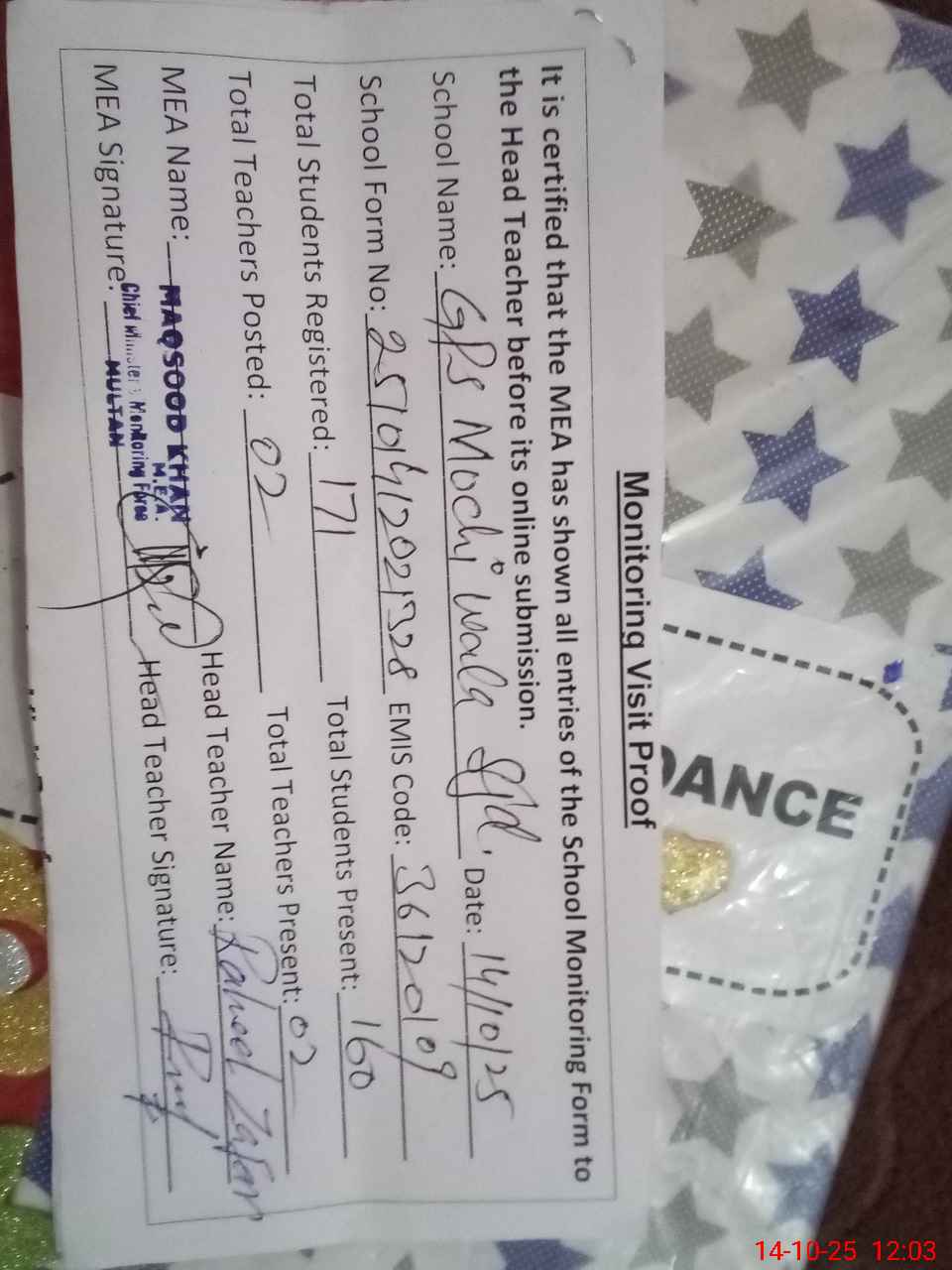 | Certified that this School was Inspected by the Undersigned MEA/DMO Today and the Information Stated Above is as Per Record. | |||||