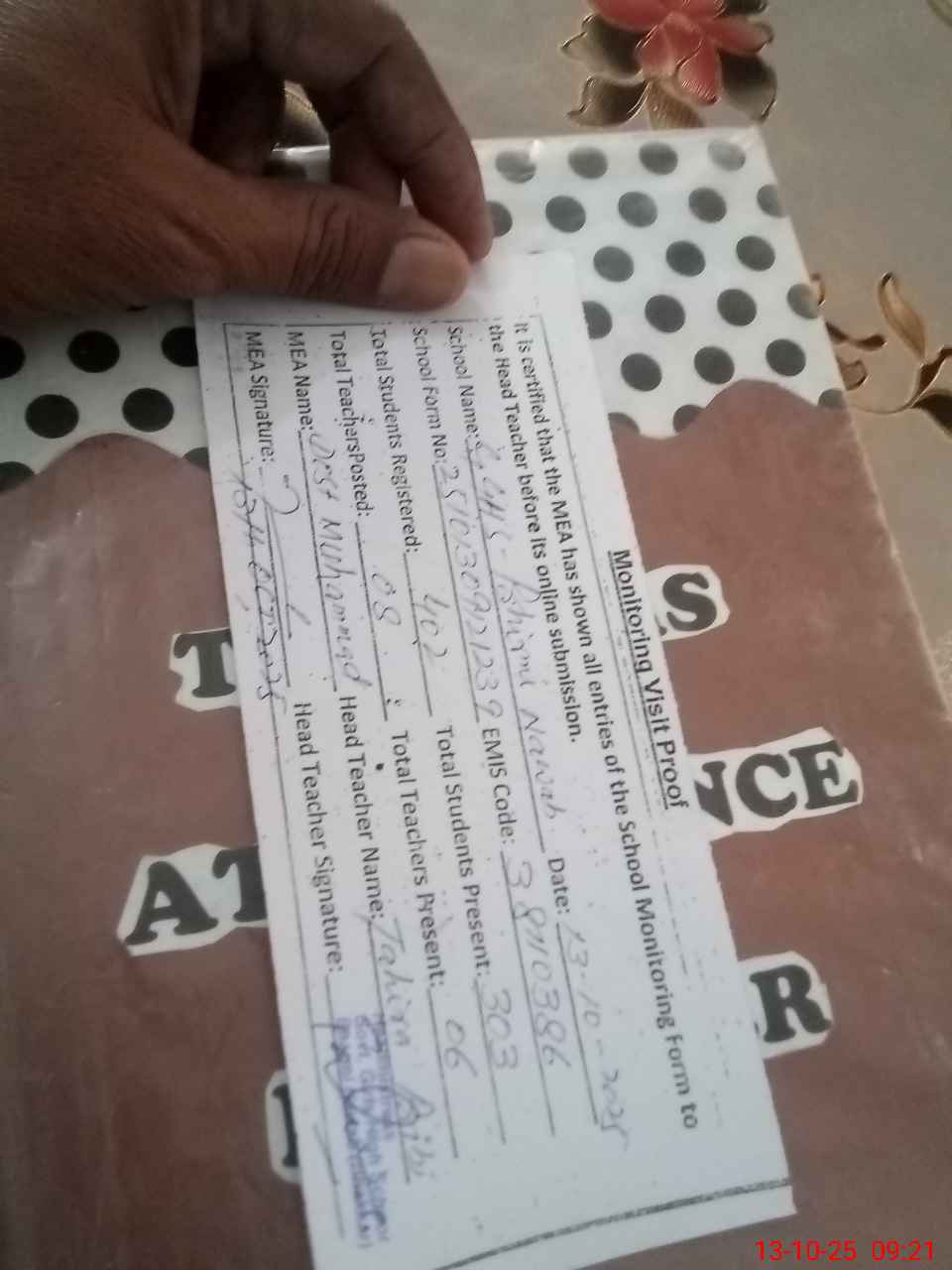 | Attendance Register | Head Teacher | MEA with School | Visit Proof |