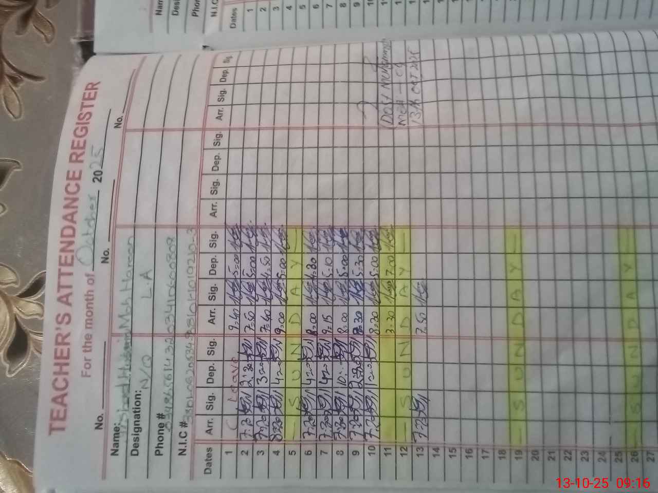| Name: NA**** PE**** Designation: (School Headmaster's/Headmistress's) HM Phone/Cell Number: 03**** |