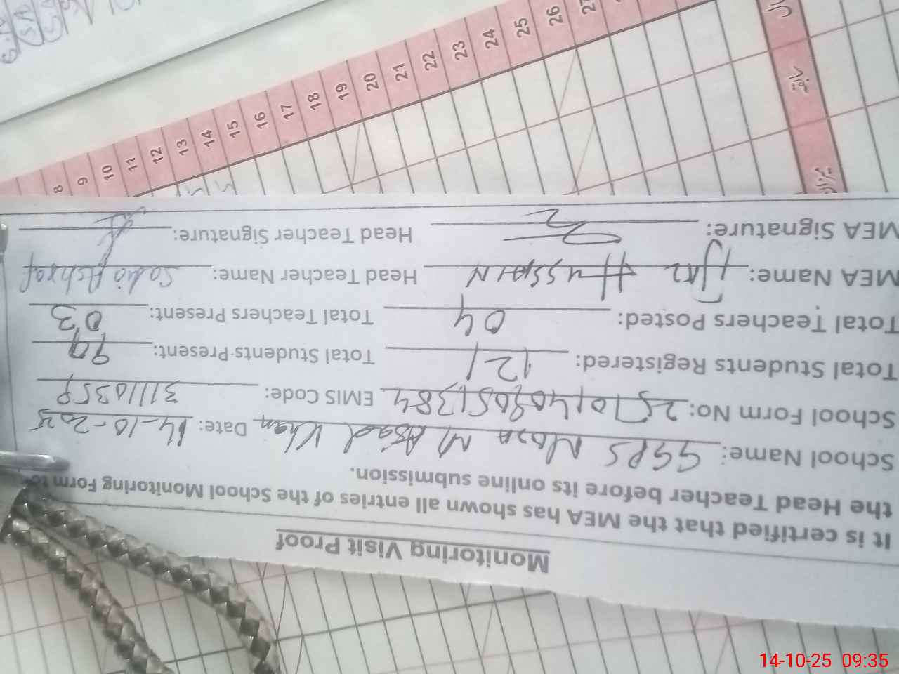 | Attendance Register | Head Teacher | MEA with School | Visit Proof |