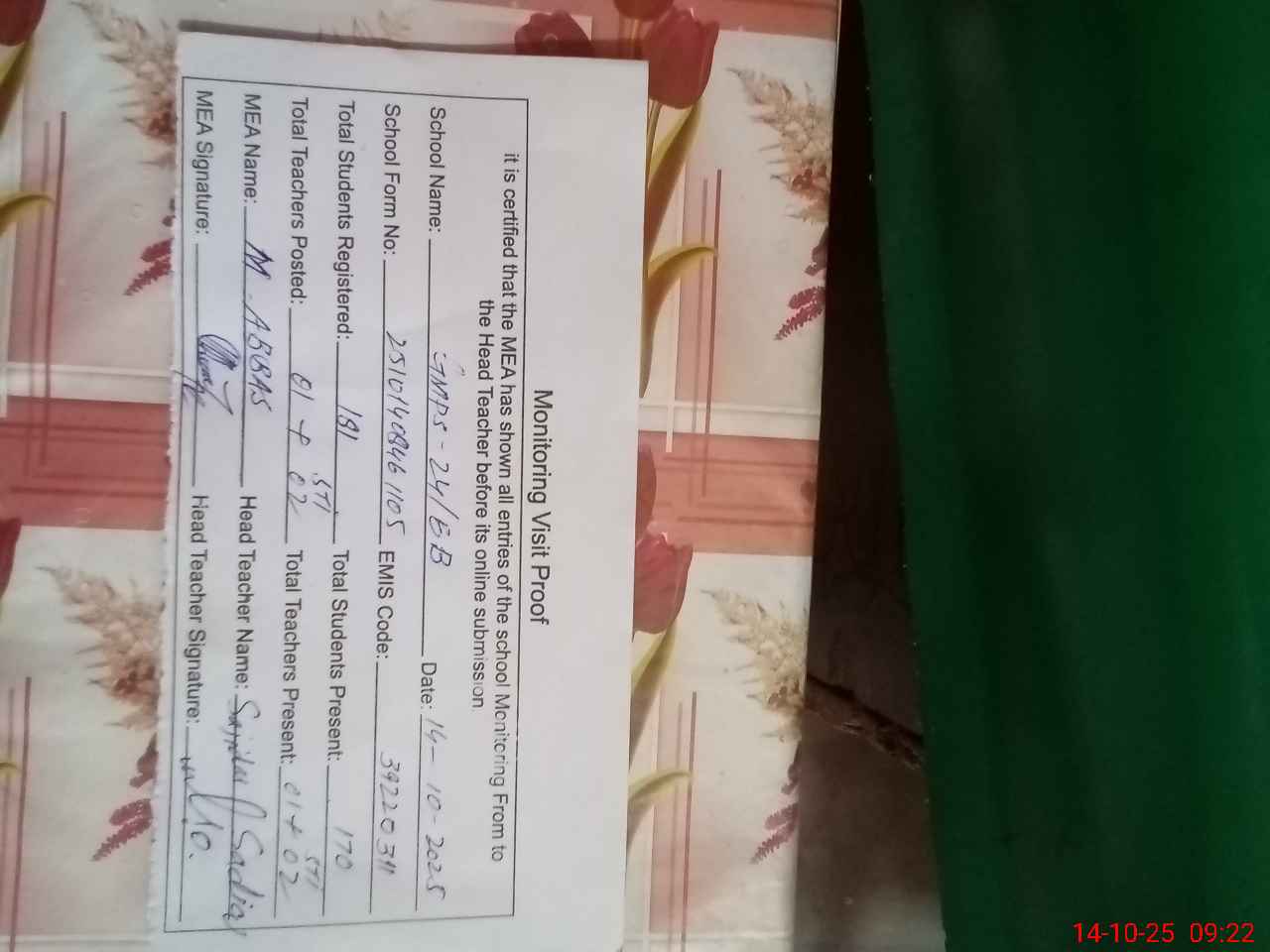 | Certified that this School was Inspected by the Undersigned MEA/DMO Today and the Information Stated Above is as Per Record. | |||||