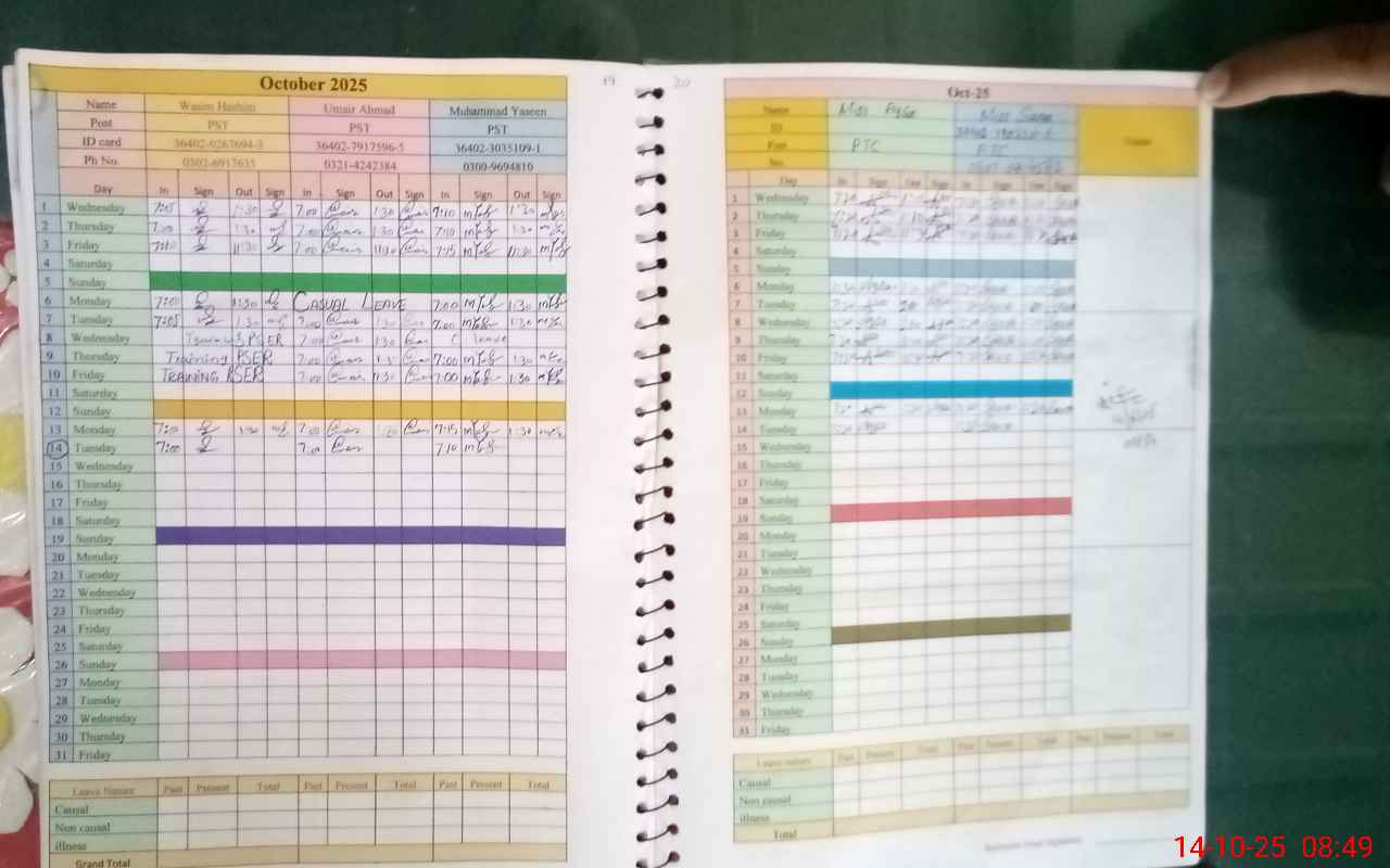 | CNIC | Full Name | Designation | R/C | Absence During Last Calender Month |