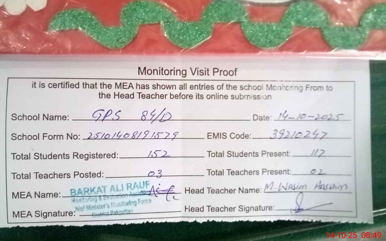 | EMIS Code: 39210247 | Name of School: GPS CHAK NO. 84 / D | |||