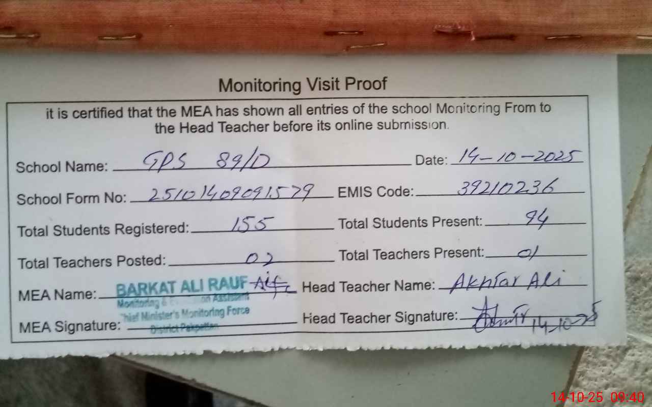 | EMIS Code: 39210236 | Name of School: GPS CHAK NO. 89 /D | |||