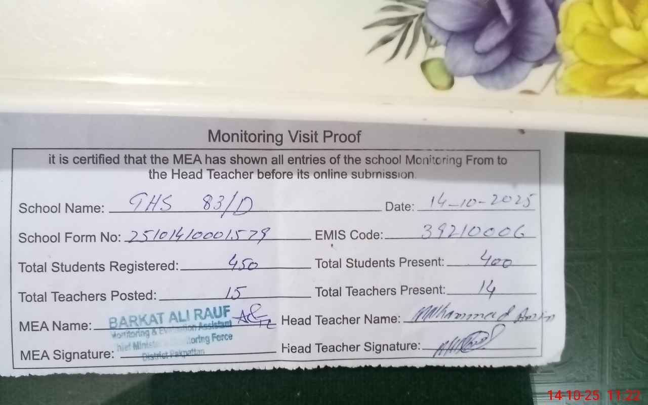 | EMIS Code: 39210006 | Name of School: GHS 83/D P.O 83/D PAKPATTAN | |||