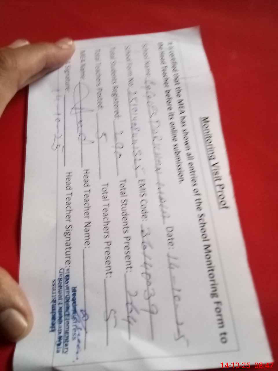 | Certified that this School was Inspected by the Undersigned MEA/DMO Today and the Information Stated Above is as Per Record. | |||||