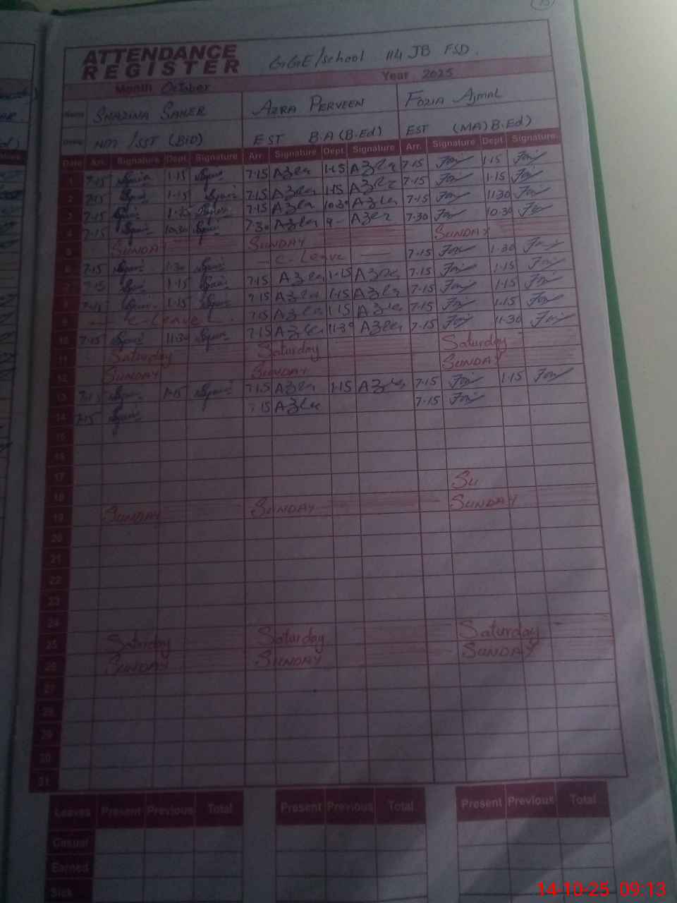| CNIC | Full Name | Designation | R/C | Absence During Last Calender Month |