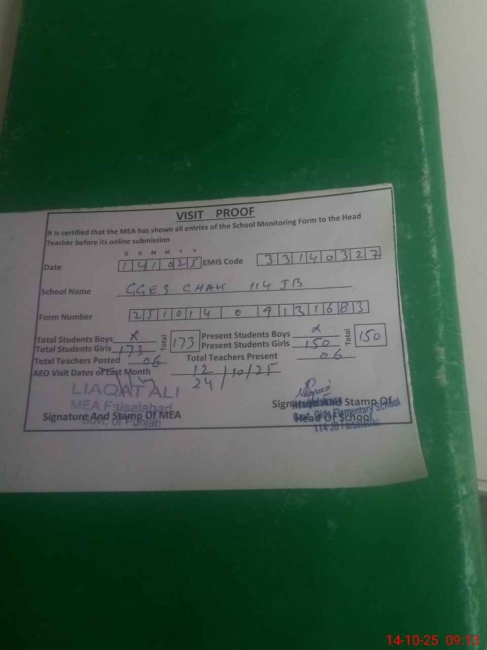 | Attendance Register | Head Teacher | MEA with School | Visit Proof |
