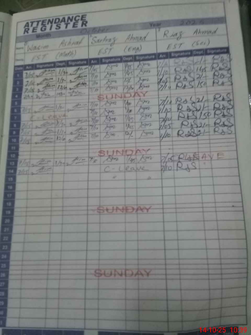 | CNIC | Full Name | Designation | R/C | Absence During Last Calender Month |