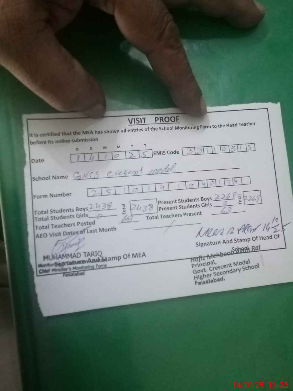 | EMIS Code: 33110315 | Name of School: GHSS CRESCENT MODEL FAISALABAD | |||