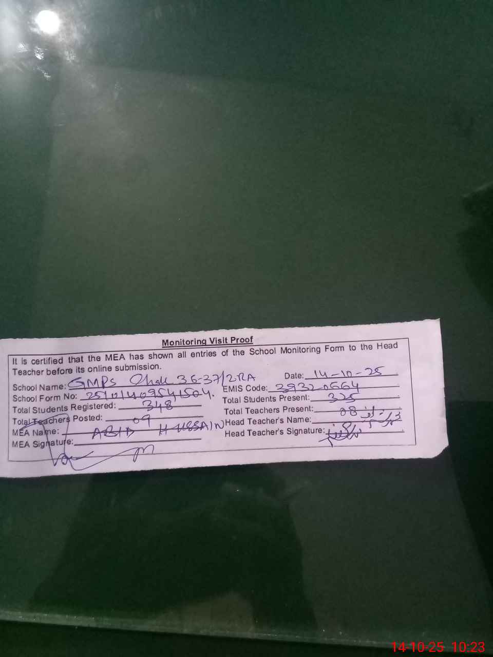 | Certified that this School was Inspected by the Undersigned MEA/DMO Today and the Information Stated Above is as Per Record. | |||||