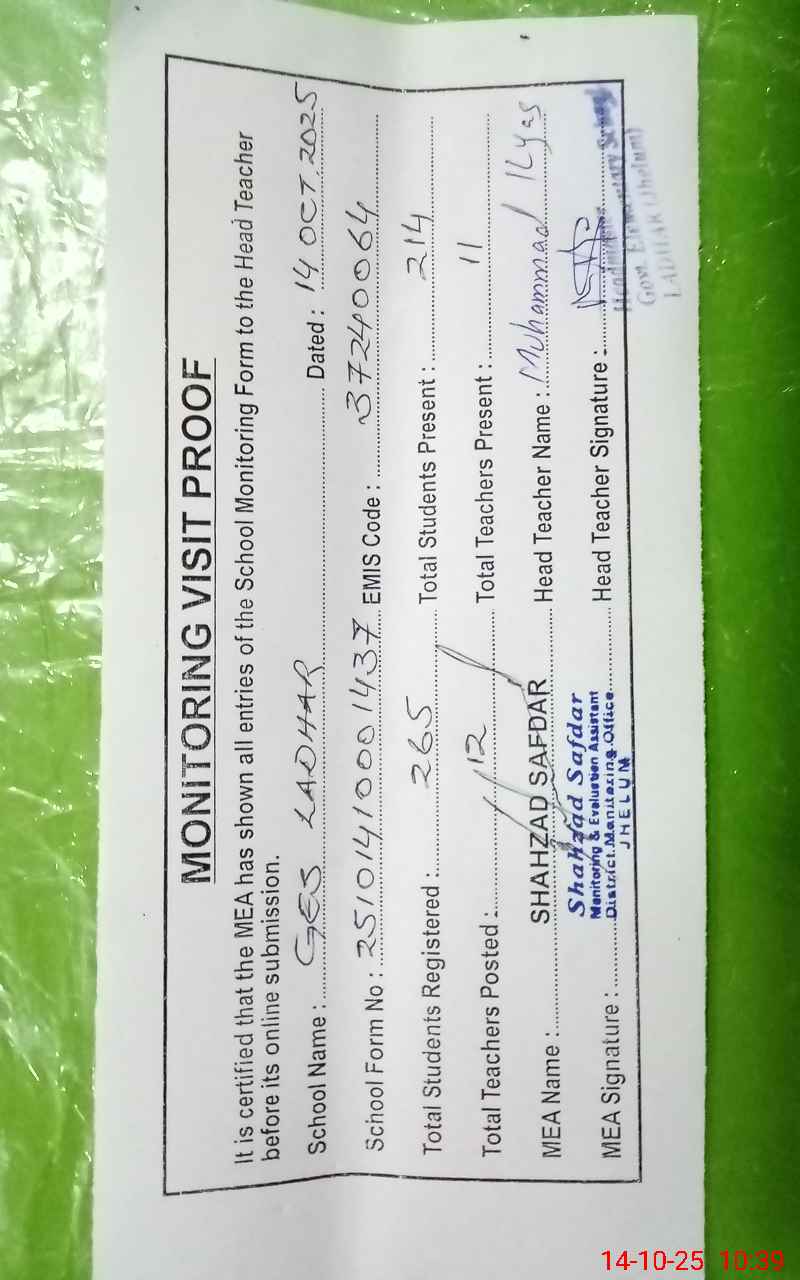 | Certified that this School was Inspected by the Undersigned MEA/DMO Today and the Information Stated Above is as Per Record. | |||||