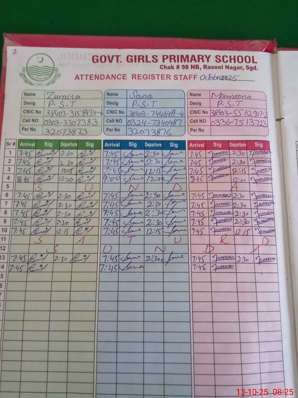 | CNIC | Full Name | Designation | R/C | Absence During Last Calender Month |