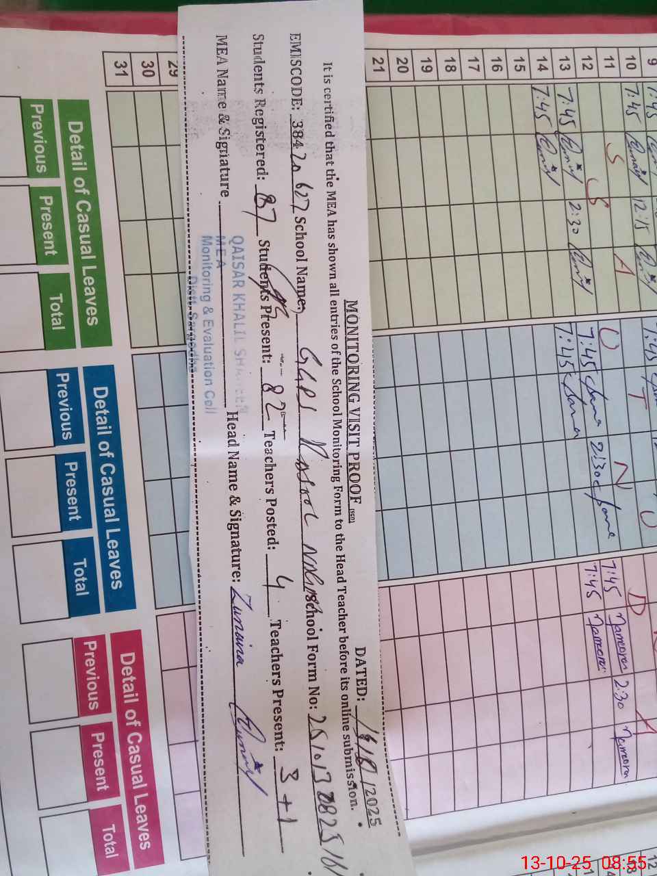| Attendance Register | Head Teacher | MEA with School | Visit Proof |