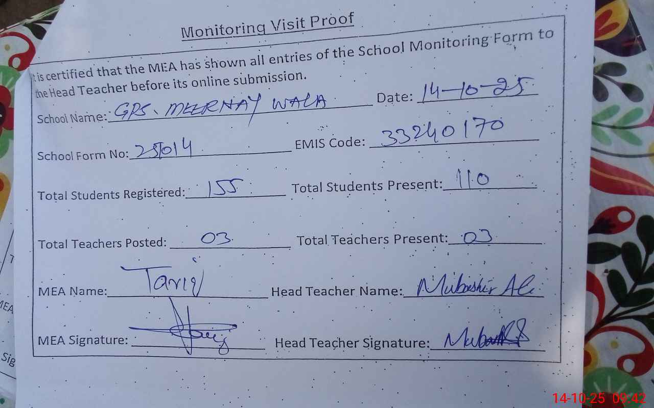 | EMIS Code: 33240170 | Name of School: GPS MEERNAY WALA | |||