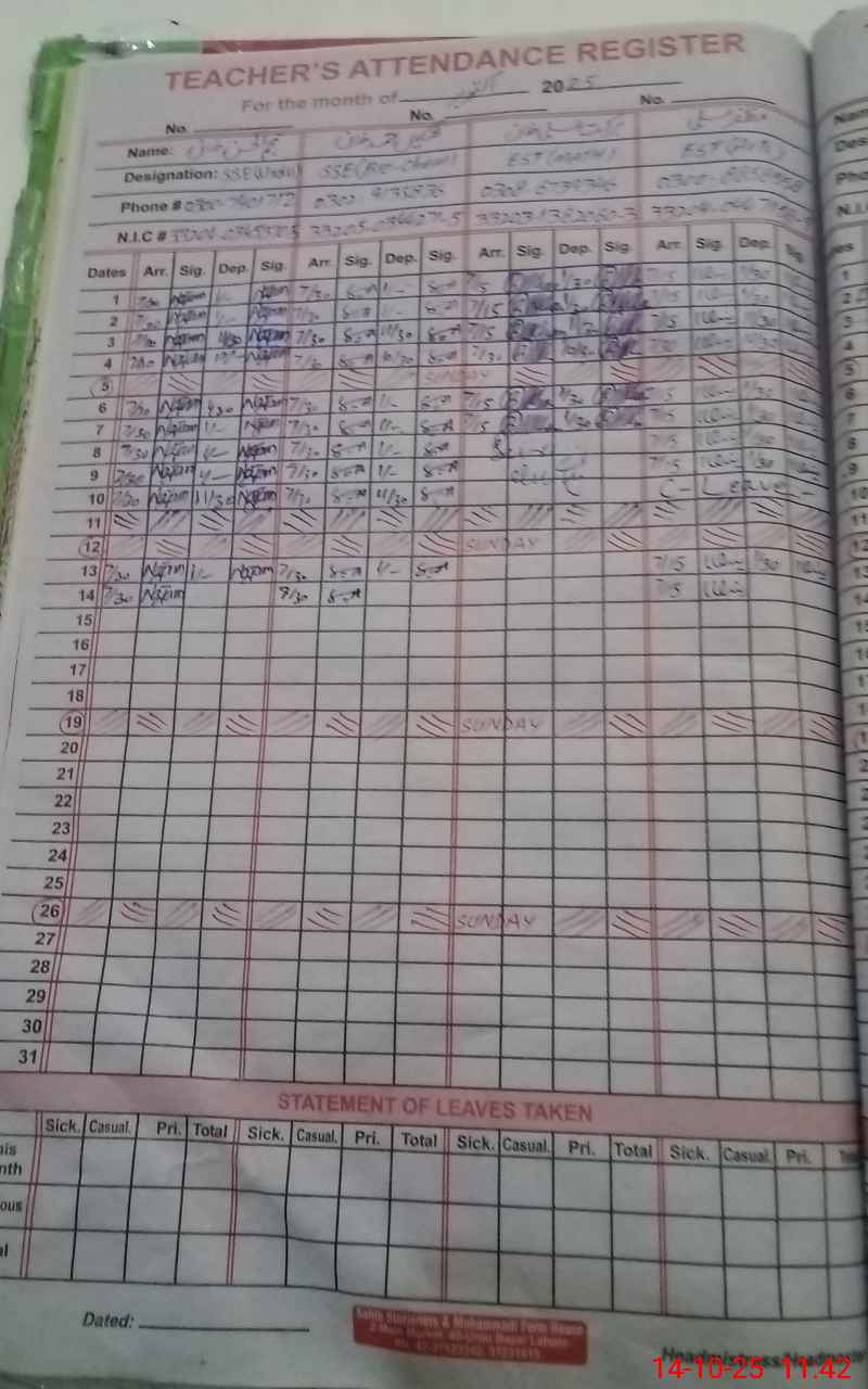 | CNIC | Full Name | Designation | R/C | Absence During Last Calender Month |