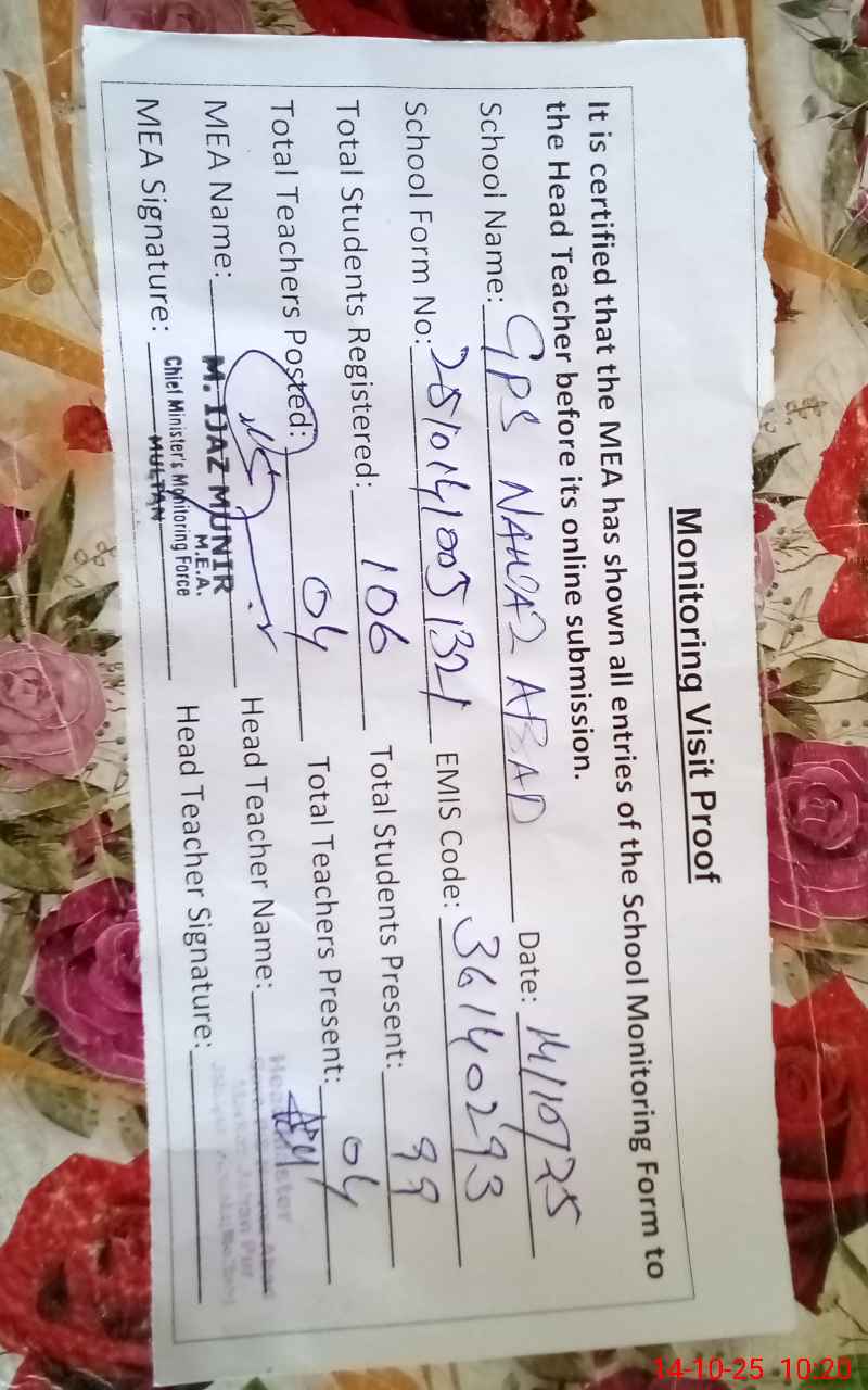 | EMIS Code: 36140293 | Name of School: GPS NAWAZ ABAD MOUZA SHADI KACHALA P/O GHAZI PUR | |||