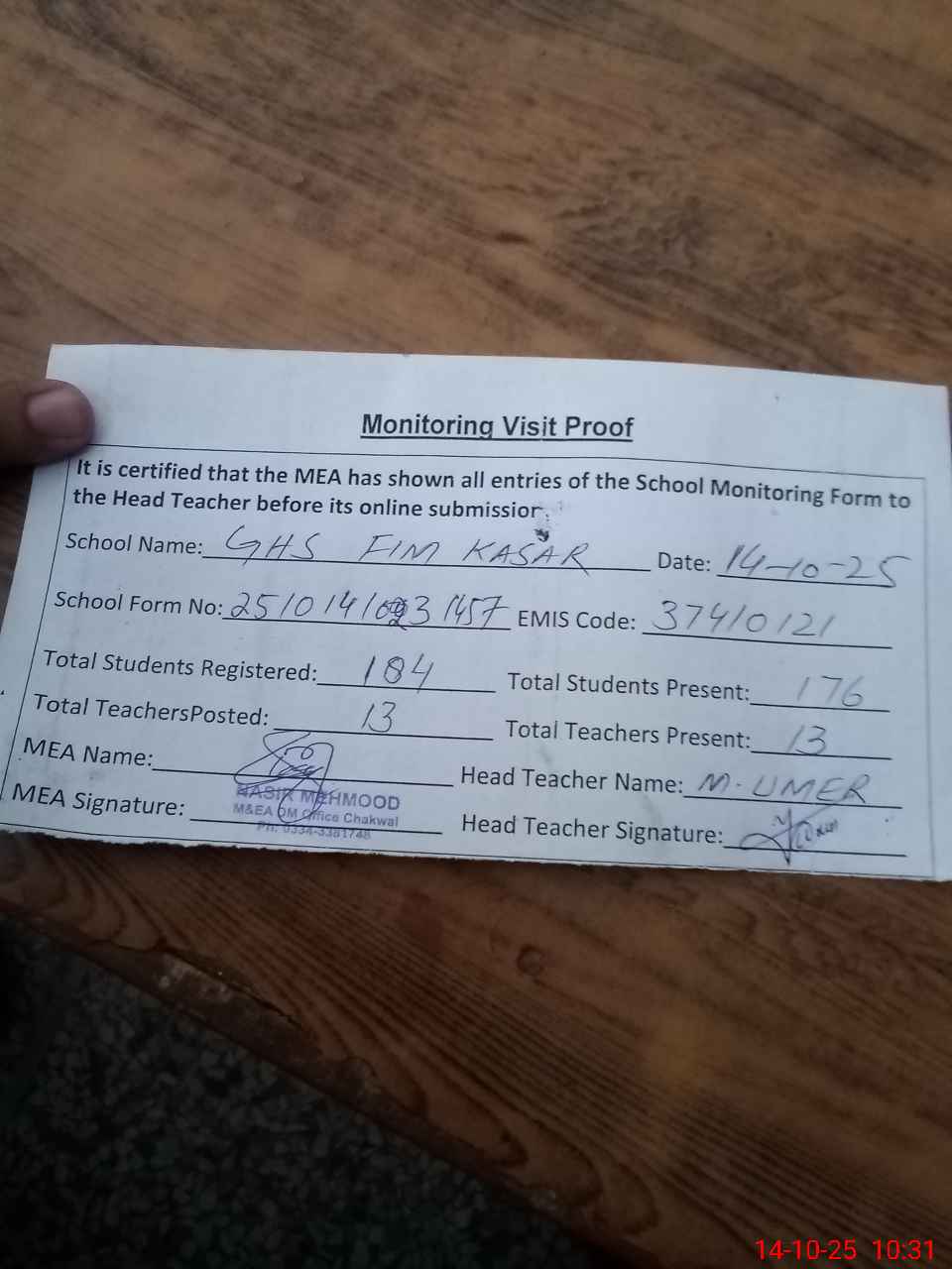 | Attendance Register | Head Teacher | MEA with School | Visit Proof |