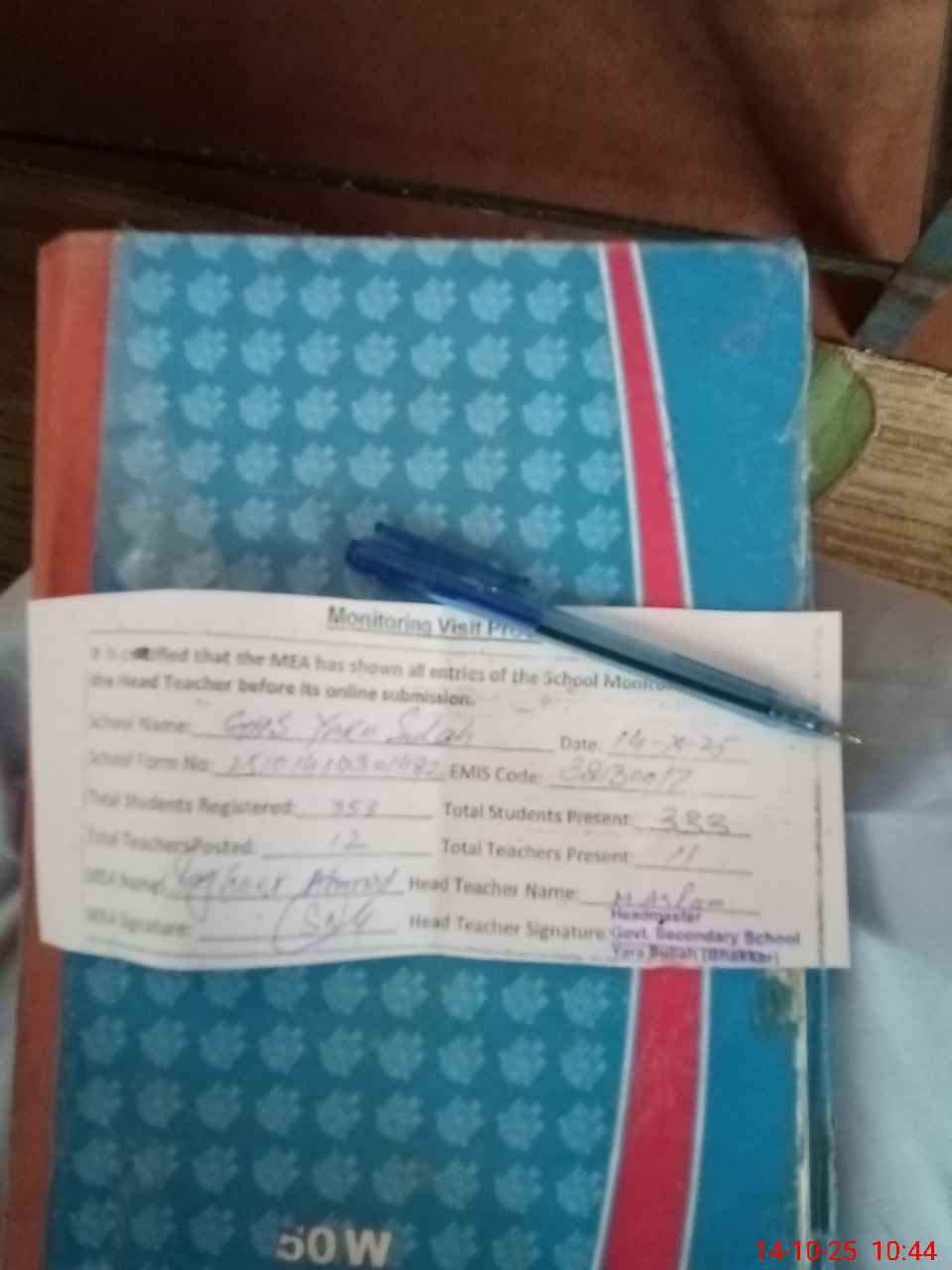 | Attendance Register | Head Teacher | MEA with School | Visit Proof |