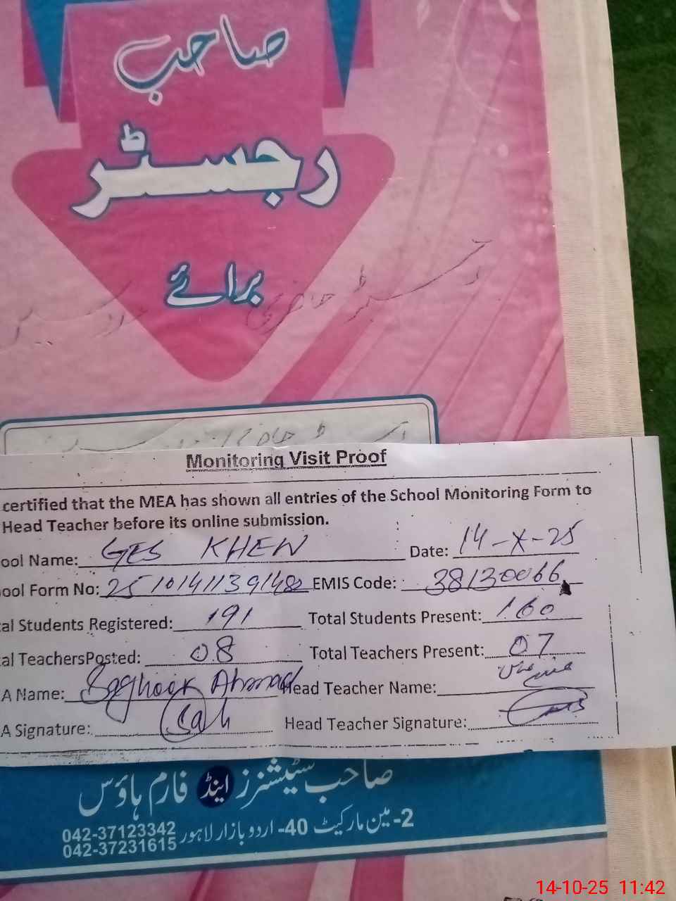 | Attendance Register | Head Teacher | MEA with School | Visit Proof |