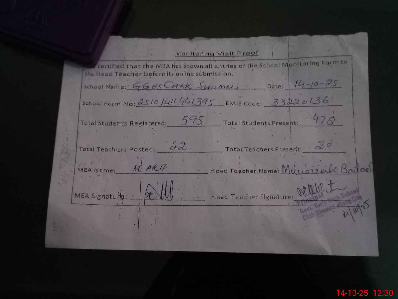 | Attendance Register | Head Teacher | MEA with School | Visit Proof |