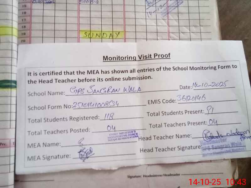 | EMIS Code: 36120146 | Name of School: GPS SANGRAN WALA P.O SHAHA PUR UBHA TEH.SHUJABAD | |||