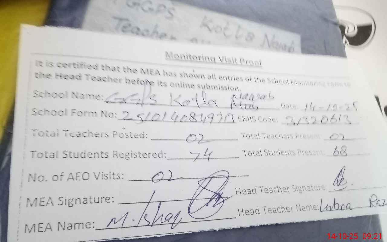 | Attendance Register | Head Teacher | MEA with School | Visit Proof |