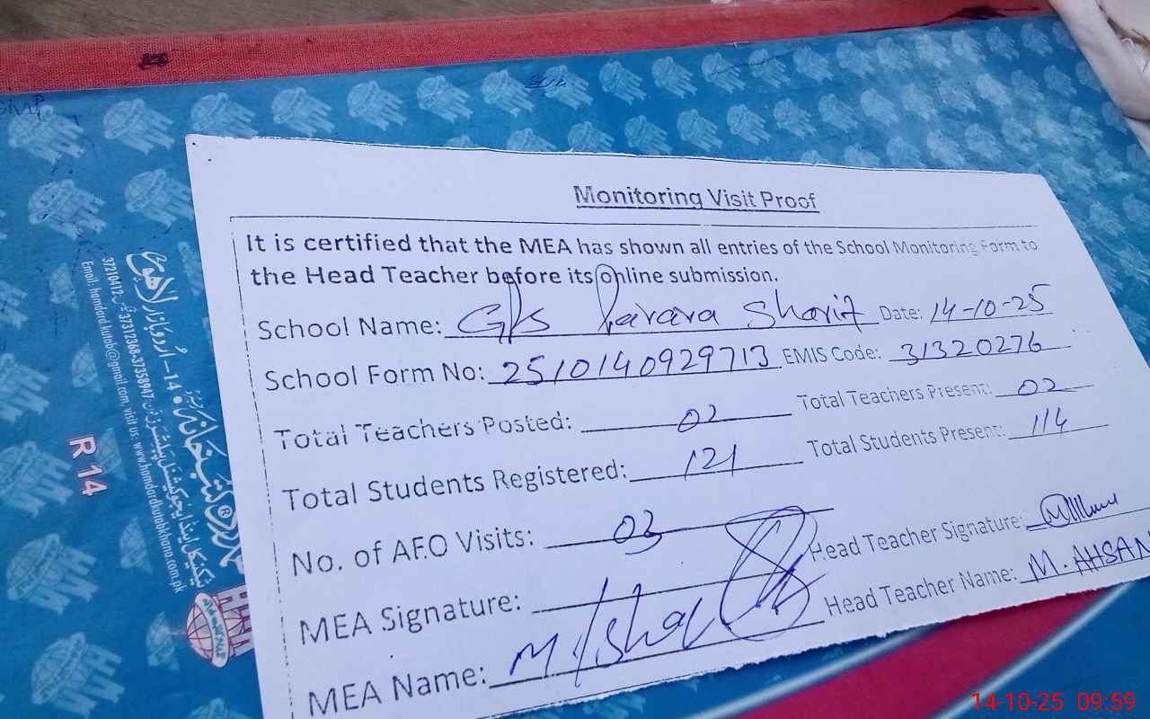 | Attendance Register | Head Teacher | MEA with School | Visit Proof |
