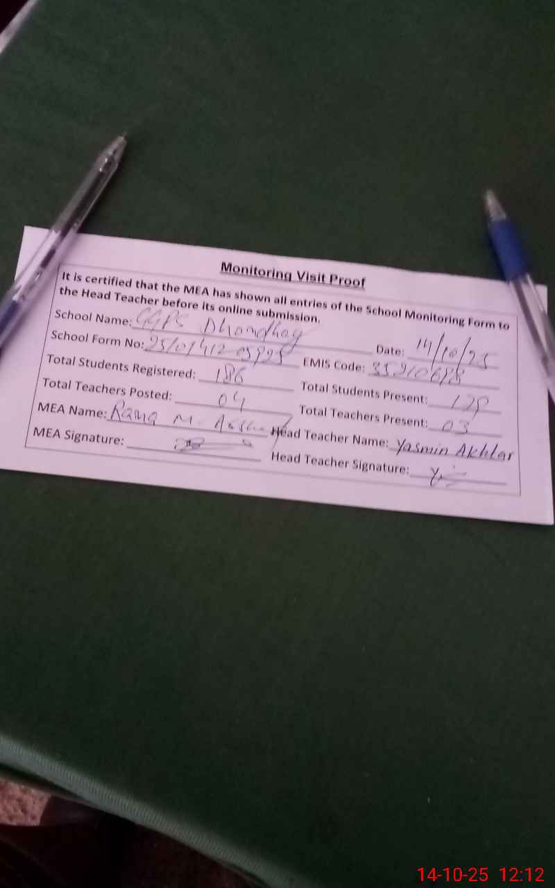 | EMIS Code: 35210698 | Name of School: GGPS DHONDAY | |||