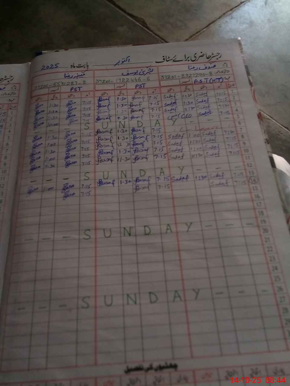 | CNIC | Full Name | Designation | R/C | Absence during last cal. month |