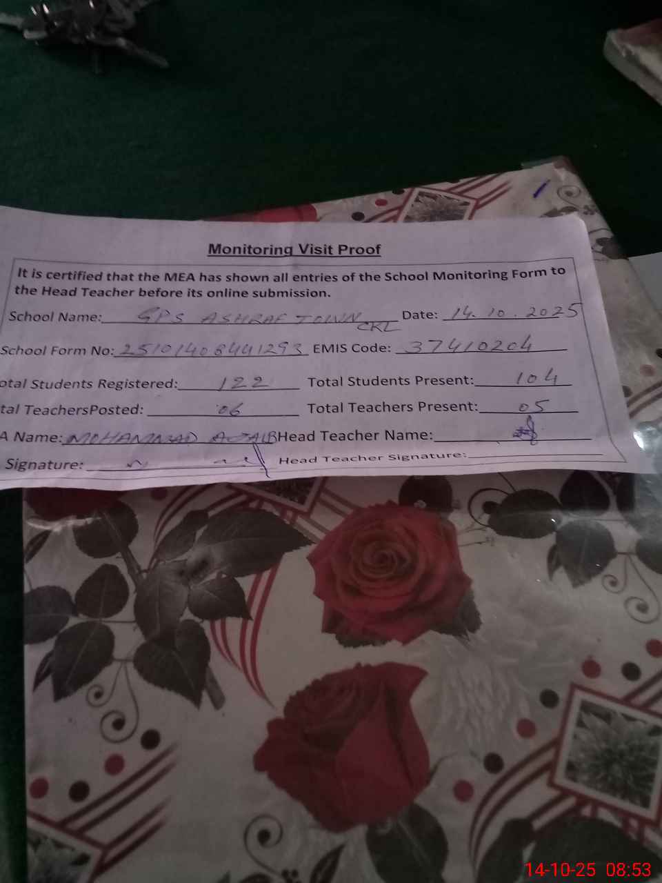 | Attendance Register | Head Teacher | MEA with School | Visit Proof |