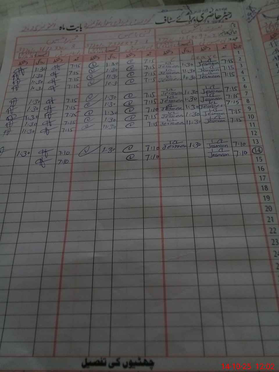 | CNIC | Full Name | Designation | R/C | Absence During Last Calender Month |