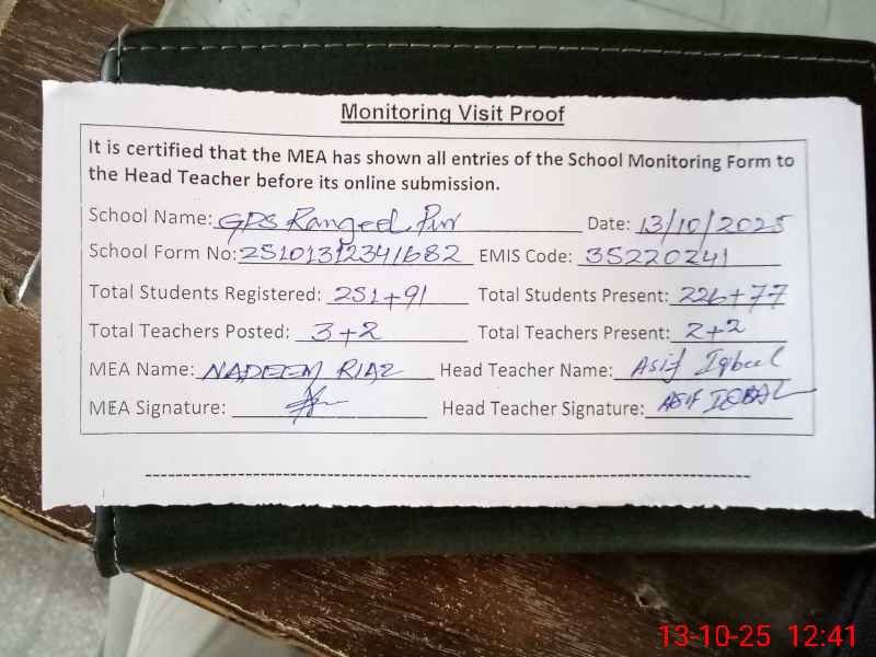 | EMIS Code: 35220241 | Name of School: GPS RANGEEL PUR P/O SUNDAR | |||
