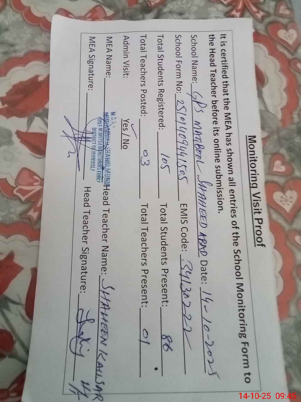 | EMIS Code: 34130222 | Name of School: GPS MAQBOOL SHAHEED ABAD | |||
