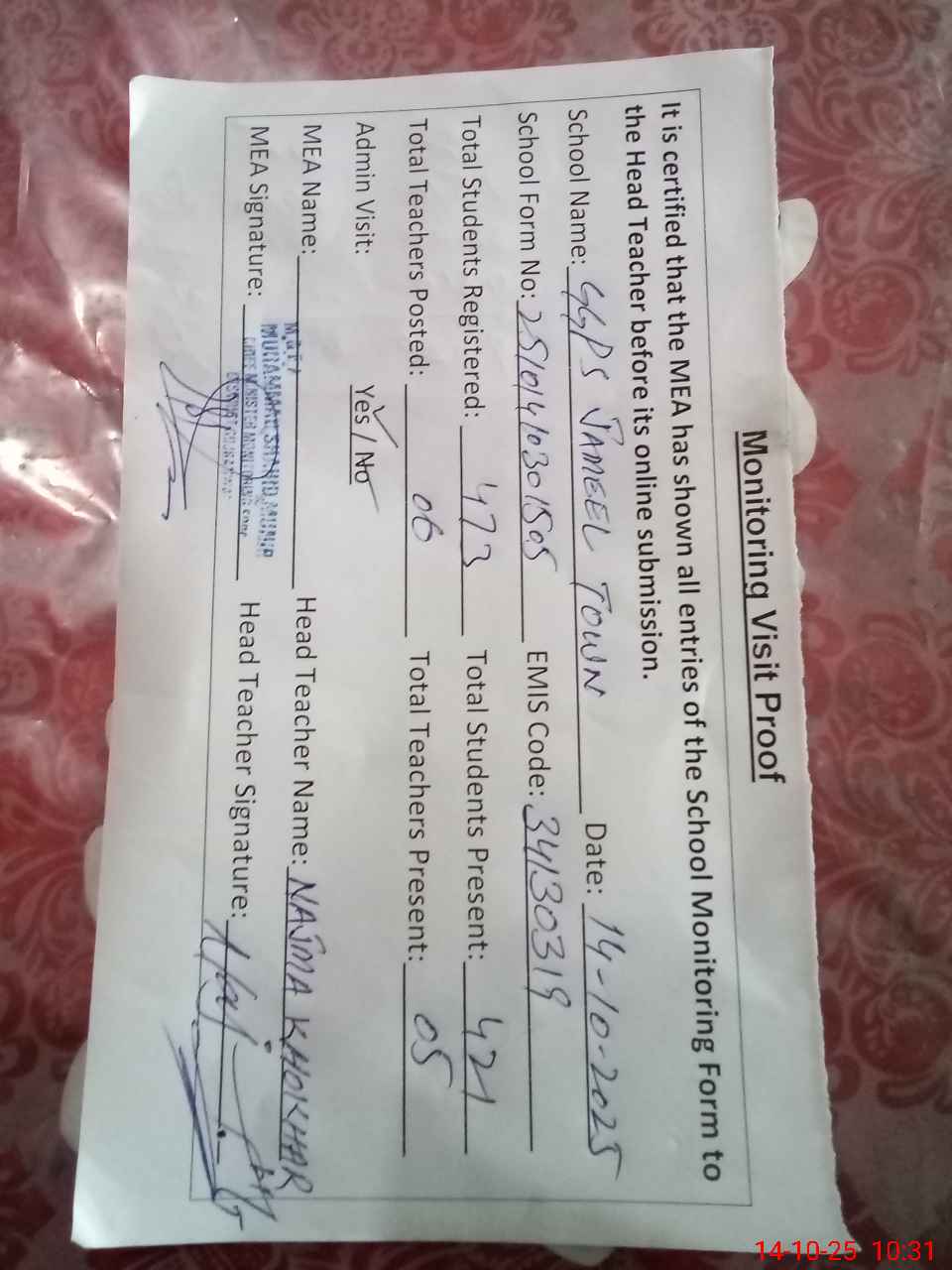 | Attendance Register | Head Teacher | MEA with School | Visit Proof |