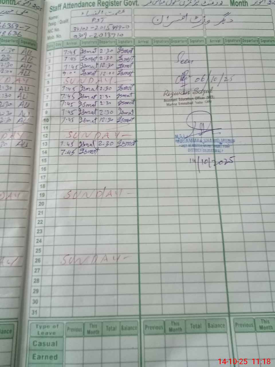 | CNIC | Full Name | Designation | R/C | Absence During Last Calender Month |