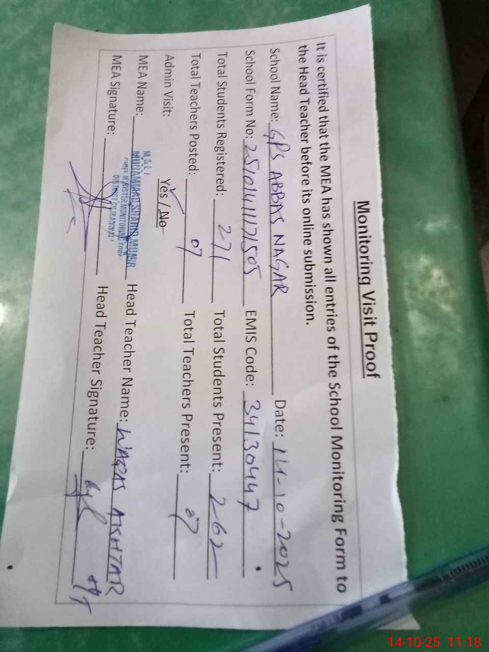 | Attendance Register | Head Teacher | MEA with School | Visit Proof |