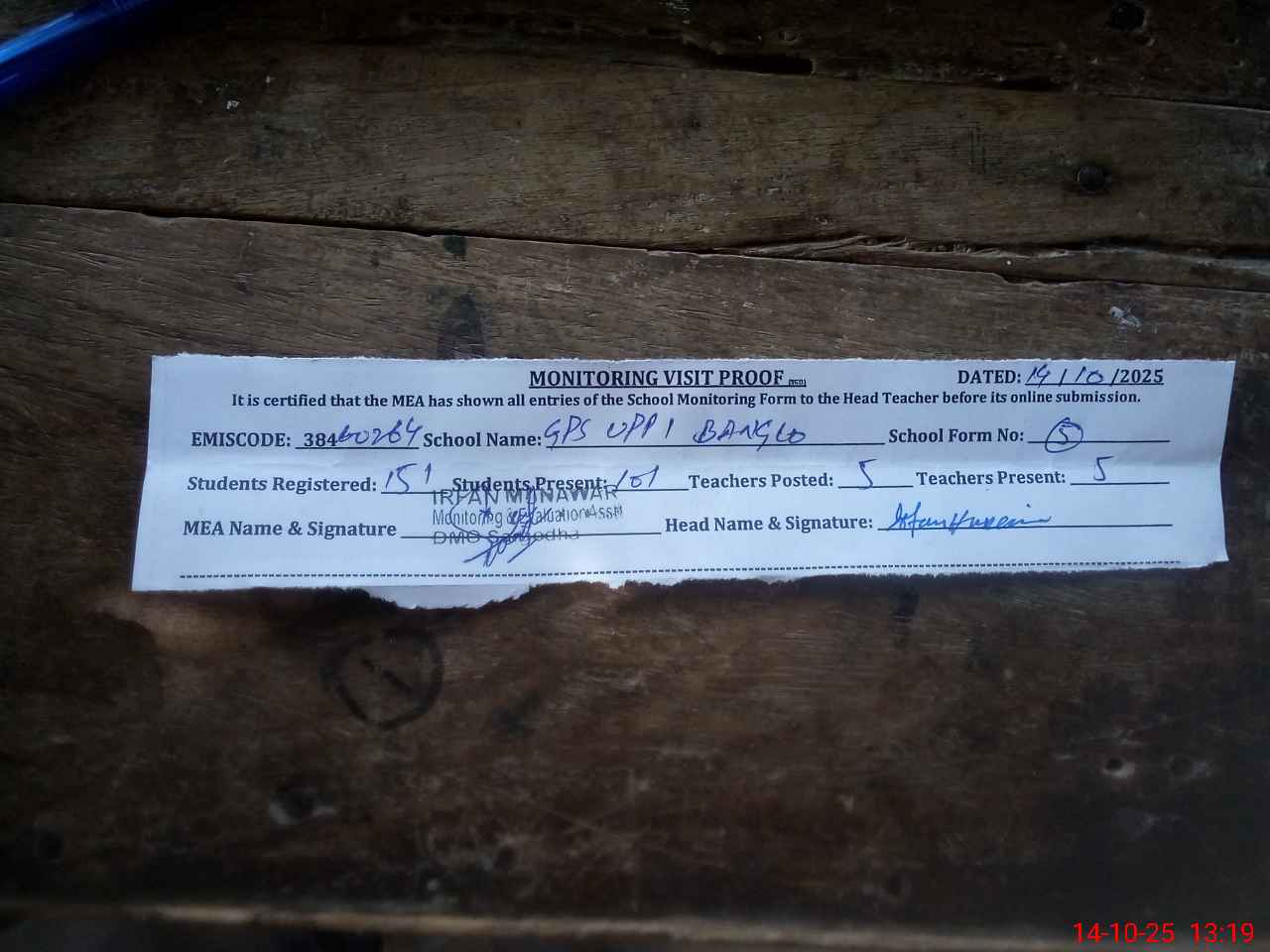 | Certified that this School was Inspected by the Undersigned MEA/DMO Today and the Information Stated Above is as Per Record. | |||||