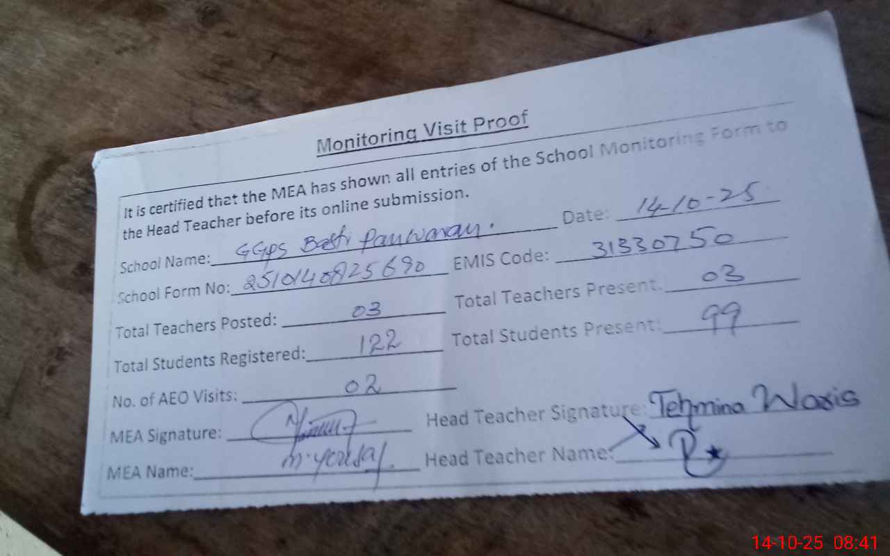 | Attendance Register | Head Teacher | MEA with School | Visit Proof |