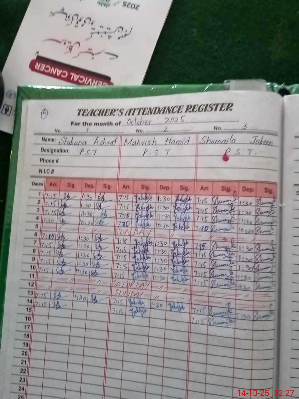 | CNIC | Full Name | Designation | R/C | Absence During Last Calender Month |