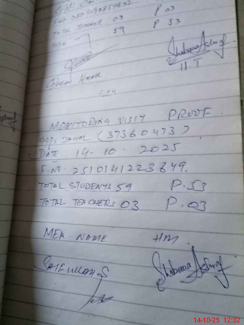 | Attendance Register | Head Teacher | MEA with School | Visit Proof |