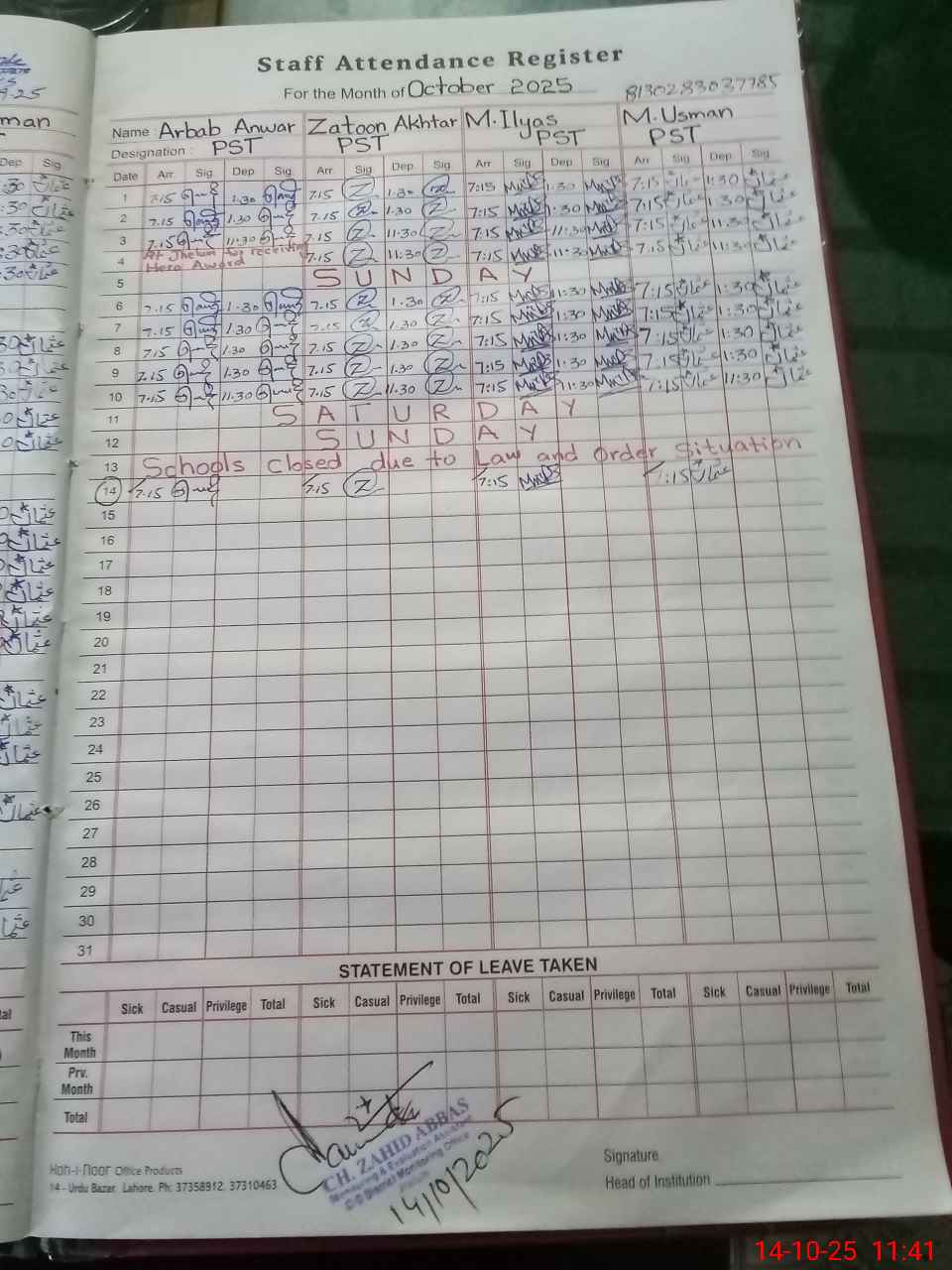 | CNIC | Full Name | Designation | R/C | Absence During Last Calender Month |