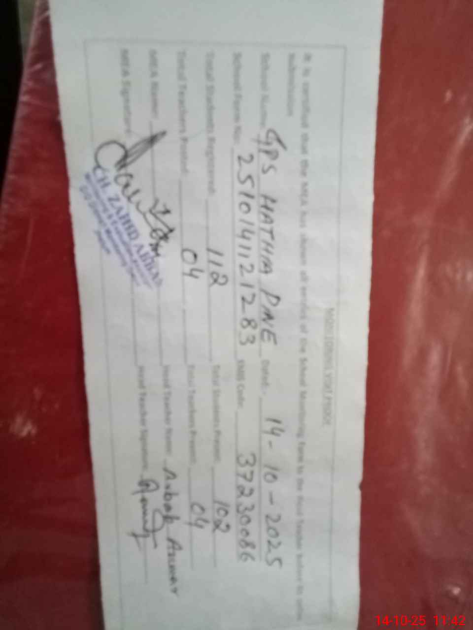 | Attendance Register | Head Teacher | MEA with School | Visit Proof |