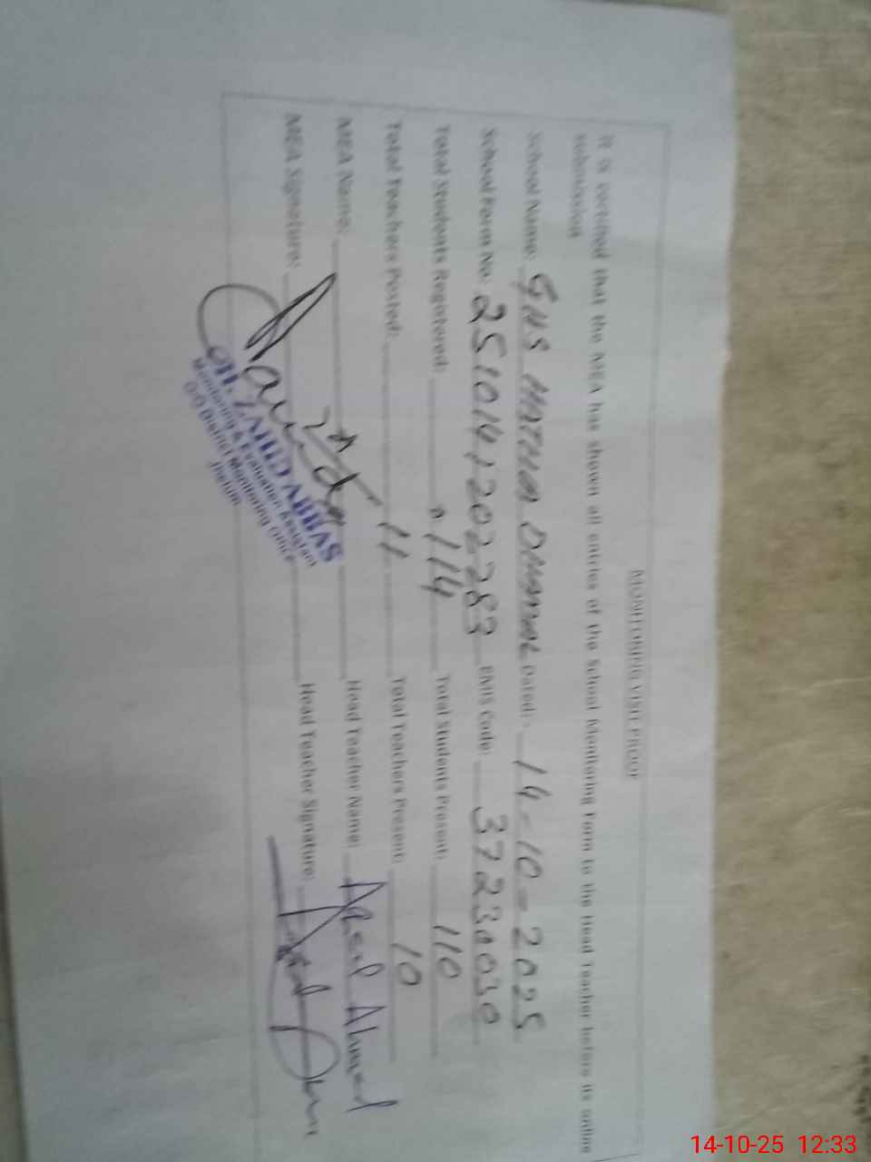 | Certified that this School was Inspected by the Undersigned MEA/DMO Today and the Information Stated Above is as Per Record. | |||||